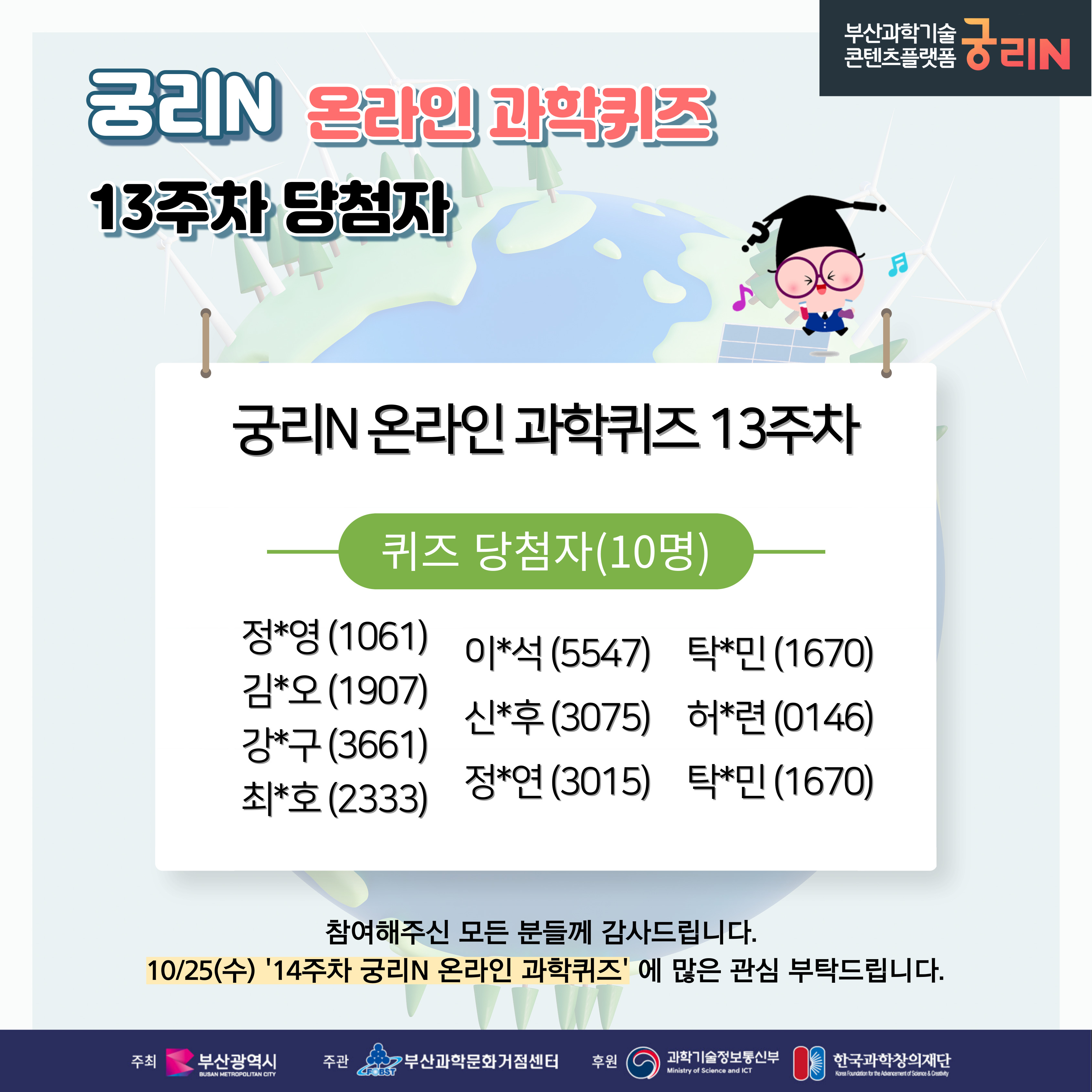 궁리N 온라인 과학퀴즈 13주차 (당첨자 및 정답 발표)